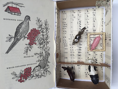 The kids so enjoyed gathering and placing items in their boxes. This kept them busy for over two hours as they placed things inside, took them out, tried other things and then started all over again. How awesome is this "Explorer" box created by a nine year old boy? I love how he used the music sheet that says, "Affection" to convey his love of exploring the outside. The grass photo was a scrap leftover from one of his friends' gatherings from home and the other is an old hiking map of a mountain trail in British Columbia.